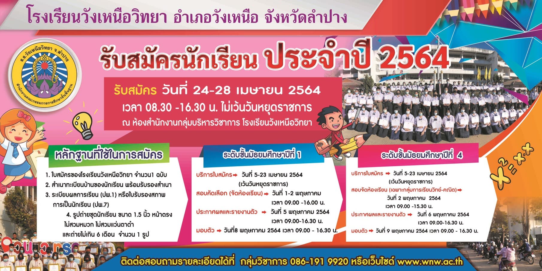 ประกาศโรงเรียนวังเหนือวิทยา เรื่อง รับสมัครนักเรียนปีการศึกษา 2564