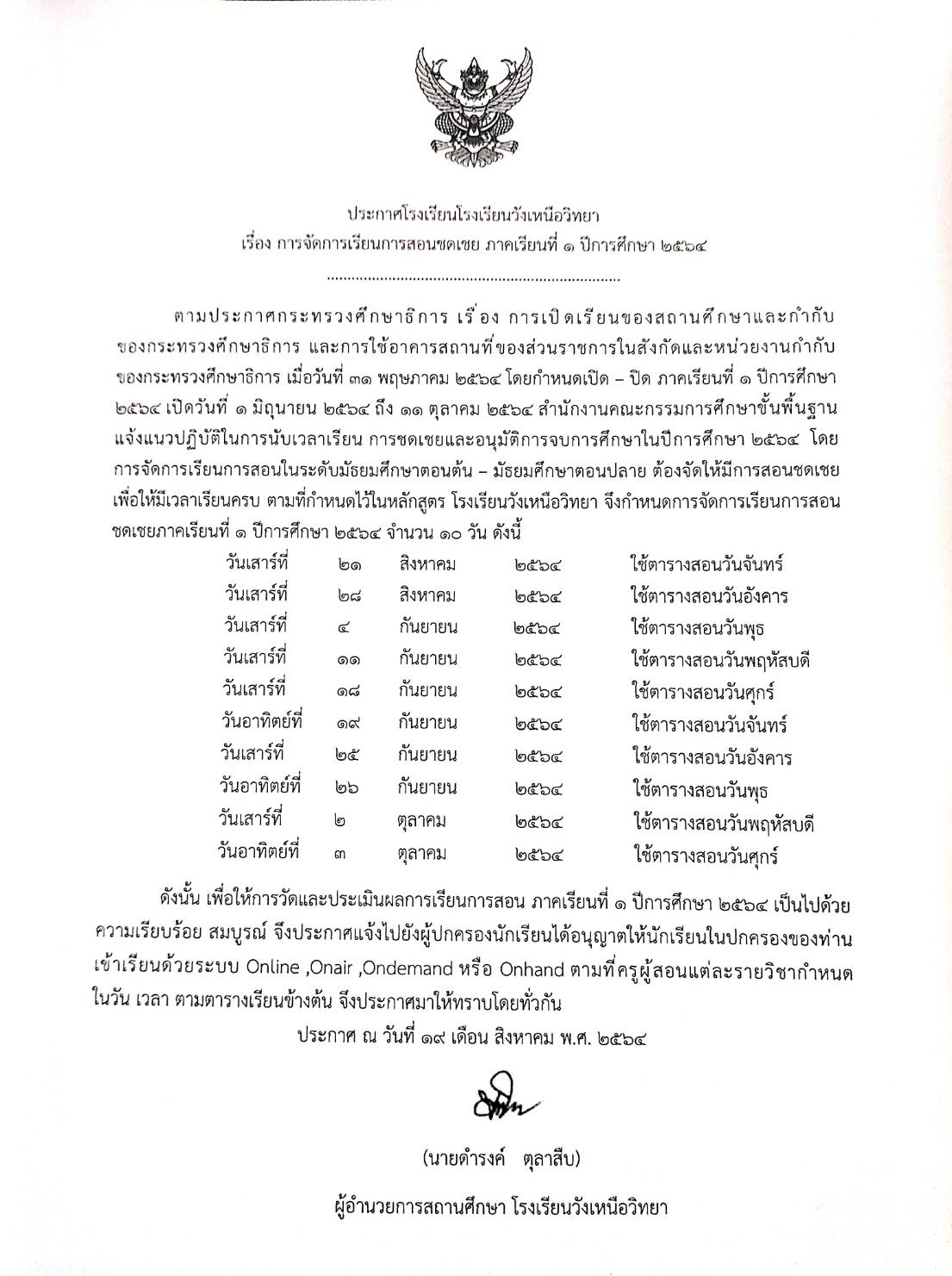 ประกาศจัดการเรียนการสอนชดเชย