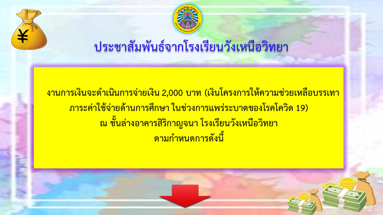 งานการเงินจะดำเนินการจ่ายเงิน 2,000 บาท (เงินโครงการให้ความช่วยเหลือบรรเทาภาระค่าใช้จ่ายด้านการศึกษา ในช่วงการแพร่ระบาดของโรคโควิด 19)