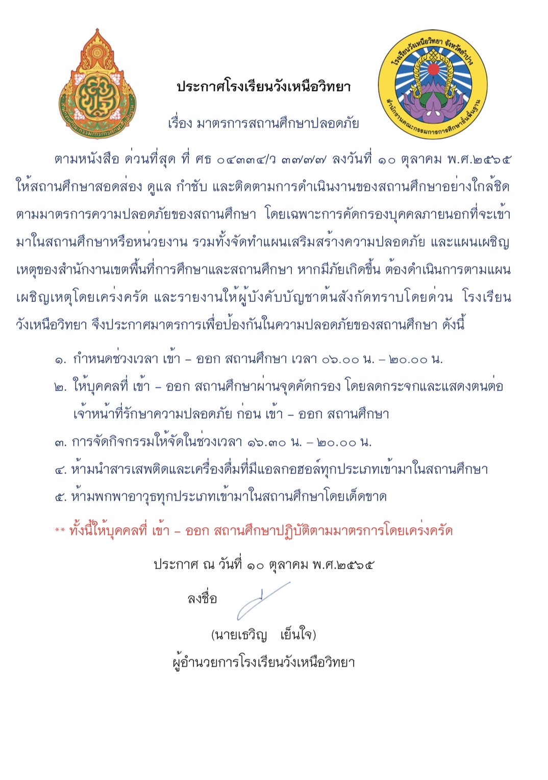 ประกาศโรงเรียนวังเหนือวิทยาเรื่องสถานศึกษาปลอดภัย