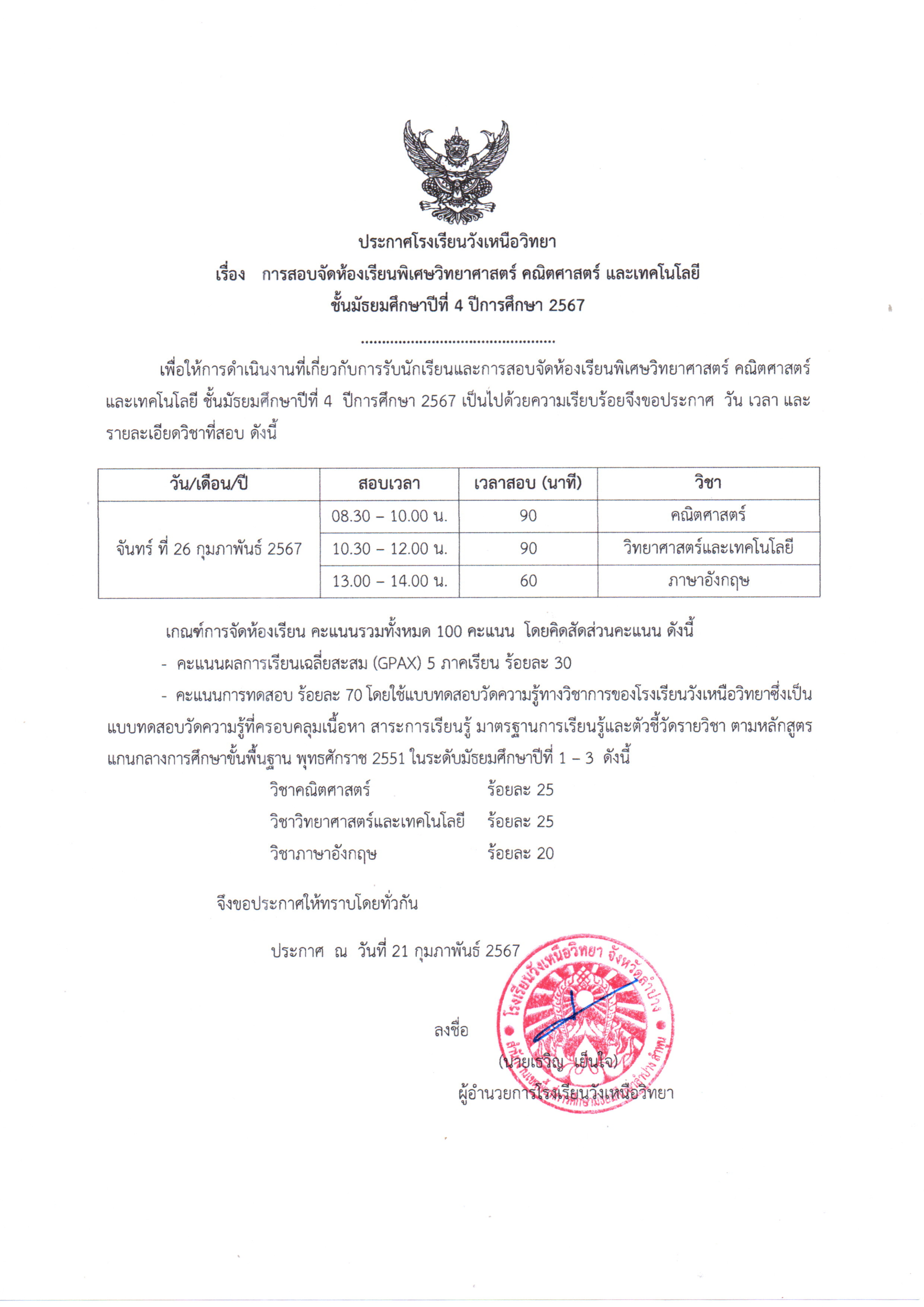 รายชื่อผู้มีสิทธิ์สอบห้องเรียนพิเศษ วันจันทร์ที่ 26 กุมภาพันธ์ 2567