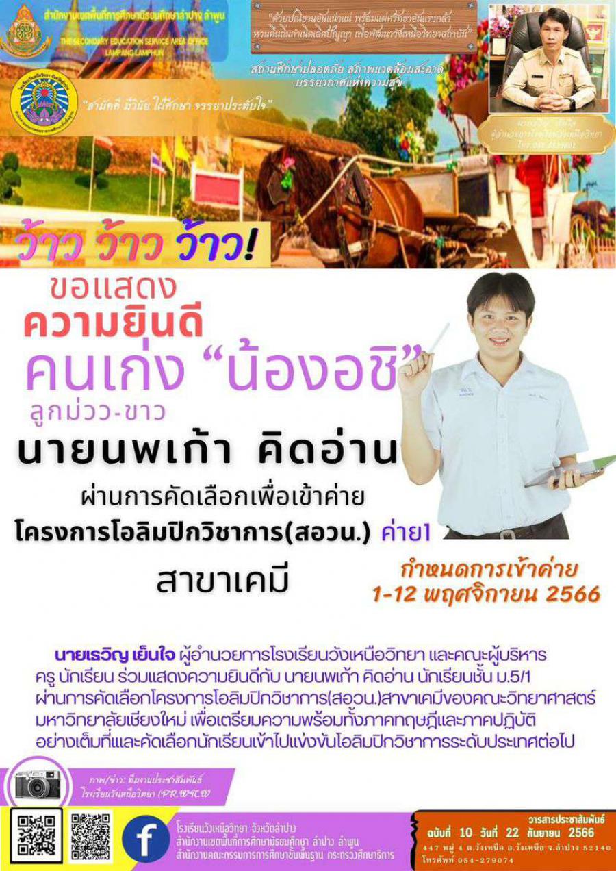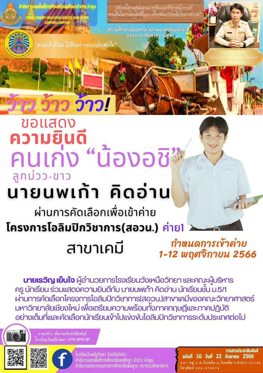 นายนพเก้า คิดอ่าน นักเรียนชั้นมัธยมศึกษาปีที่ 5/1 ได้สอบผ่านเข้าค่ายโอลิมปิกวิชาการ (สอวน.) ค่าย 1 สาขาเคมี ซึ่งจะได้เข้าร่วมกิจกรรมค่ายฯ ในระหว่างวันที่ 1-15 ตุลาคม 2566 นี้ ณ โรงเรียนบุญวาทย์วิทยาลั